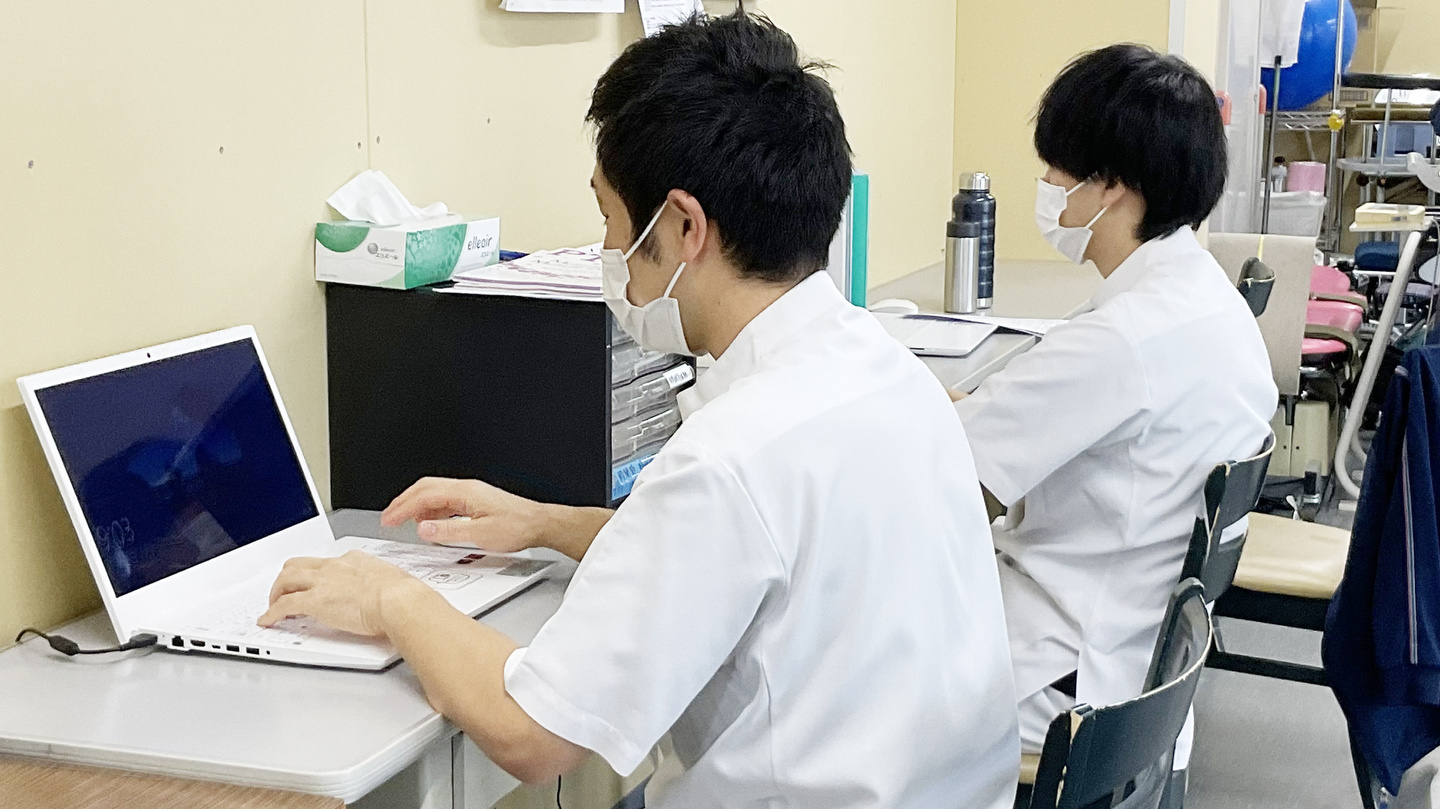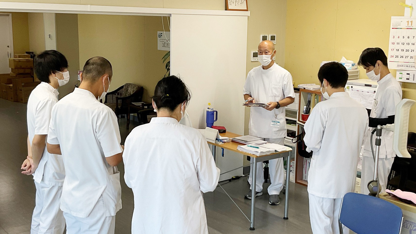 リハビリスタッフで治療前のミーティングを行います。 スタッフの体調や一日のスケジュール確認、 患者様や業務に関する情報共有を行います。