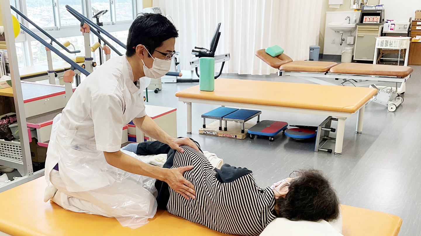 入院や外来の患者様のリハビリを行います。 急性期から療養まで様々な患者様の状態に合わせて、 リハビリ室や病室にてリハビリを行います。