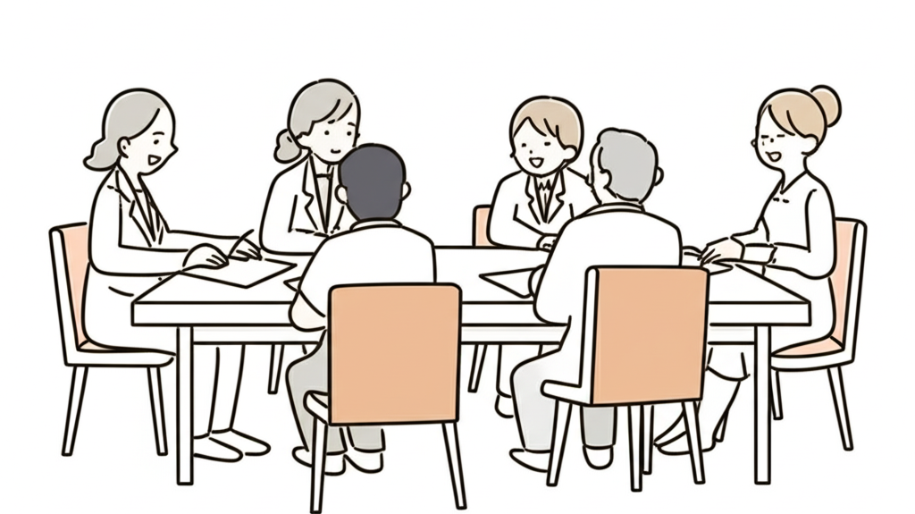 病棟のカンファレンスにリハビリスタッフが1名参加します。 入院患者様の体調や検査、手術予定、今後の方針などを共有します。 必要に応じてリハビリ状況の報告、相談をする場となります。